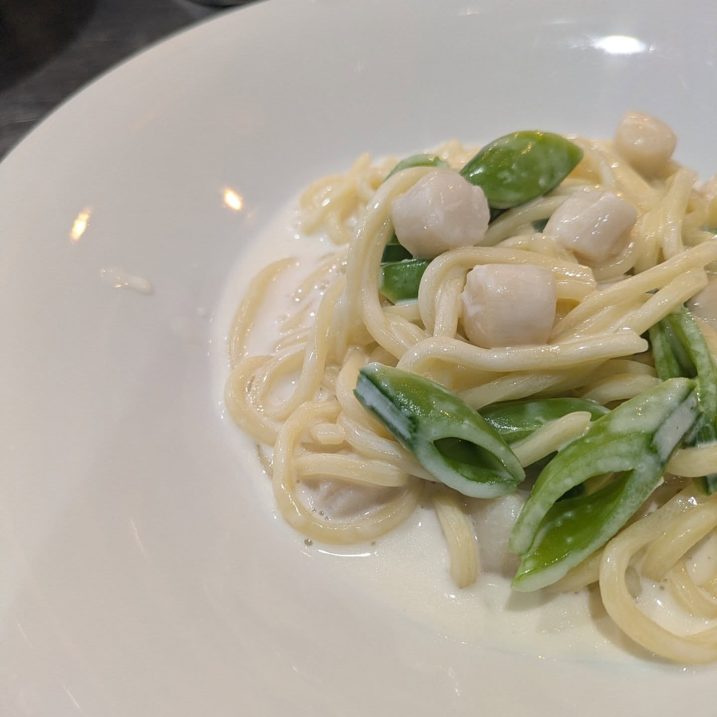 Pannaの小柱とスナップエンドウのクリームソースです